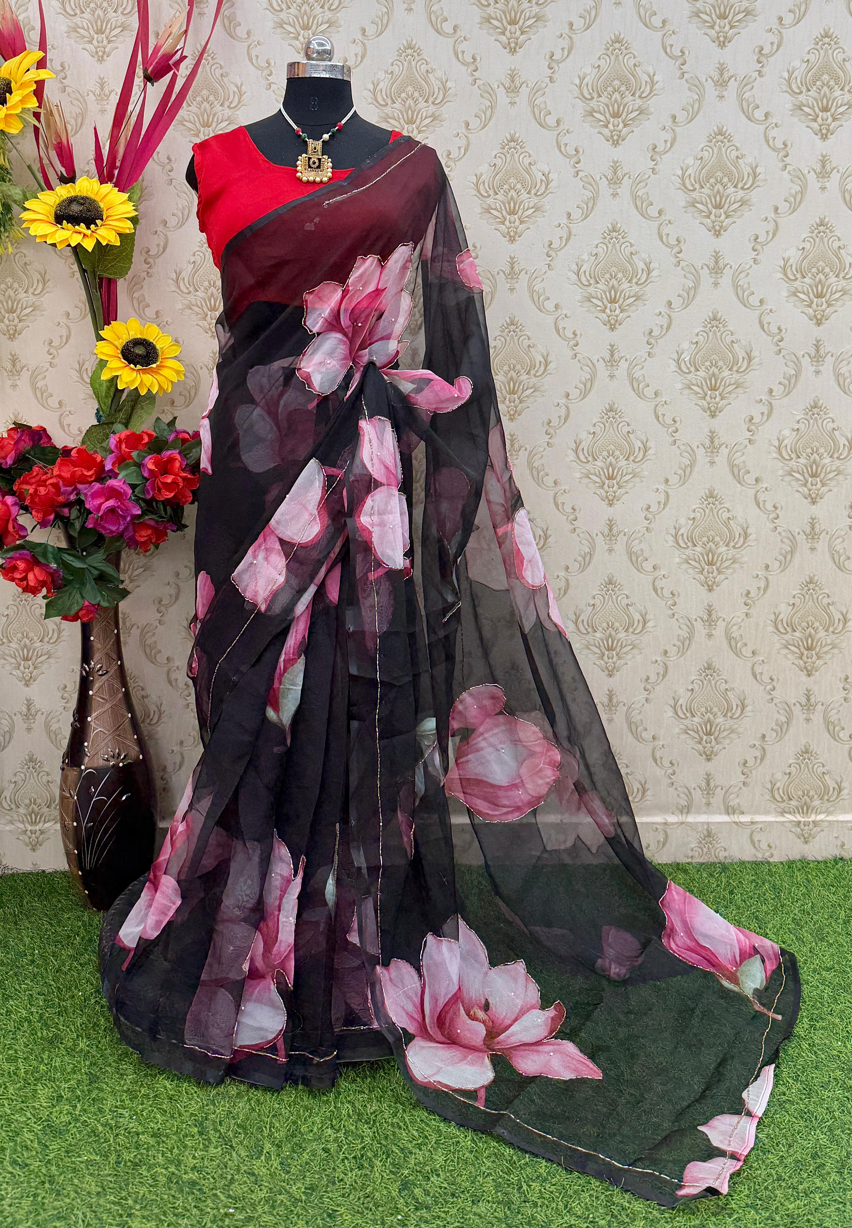 Elevate your style with our Adorning 1-Minute Ready To Wear Black Organza Silk Saree. Crafted from luxurious organza silk, this exquisite piece exudes sophistication and elegance. Perfect for any special occasion, it drapes effortlessly, making you the epitome of grace and charm.