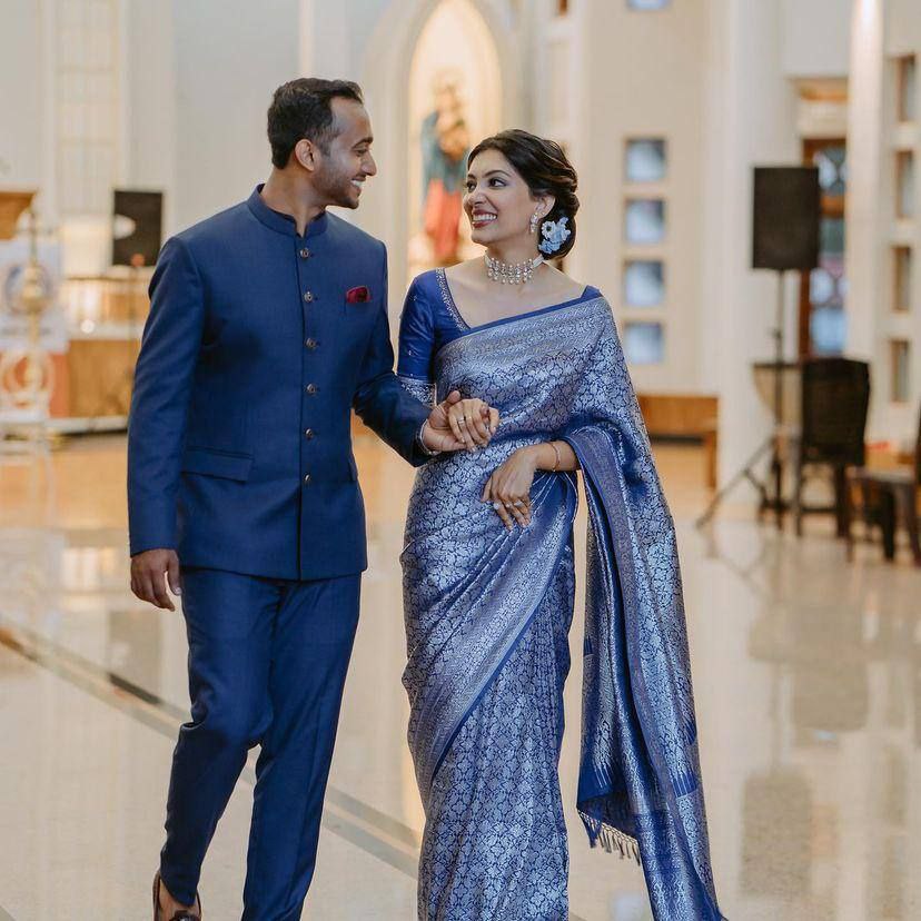 This elegant blue silk saree is the epitome of grace, featuring a silver floral motif woven into the fabric, creating a stunning contrast with the rich blue color. The pewter-toned intricate patterns enhance the saree's timeless beauty, while the matching blouse with three-quarter sleeves complements the overall look. The soft lighting beautifully highlights the luxurious fabric, making it the perfect choice for traditional and festive occasions.