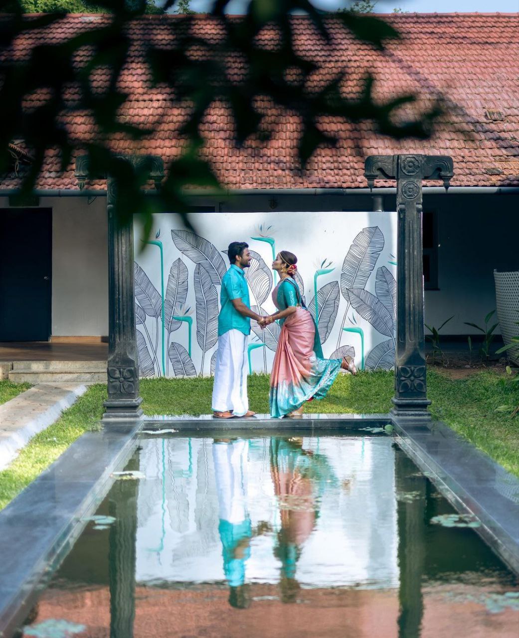 This exquisite pastel pink and vibrant teal silk saree beautifully captures the essence of South Indian bridal elegance. The luxurious fabric features intricate traditional motifs that bring out the bride’s radiant complexion. Paired with elaborate gold jewelry, including a stunning headpiece and bangles, the saree enhances her regal presence, while the serene garden setting completes the look, offering a timeless bridal aesthetic.