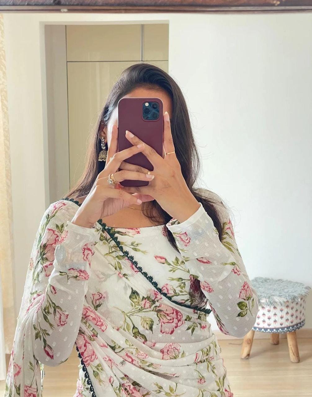 Make your moments magical with this elegant ready-to-wear white georgette saree, adorned with stunning floral prints. Designed for comfort and style, this lightweight saree drapes effortlessly, ensuring a flawless look in just a minute. Perfect for casual outings, festive occasions, or a day at work, it combines sophistication and ease. The breathable fabric keeps you comfortable, while the vibrant floral design adds a touch of charm to your wardrobe.