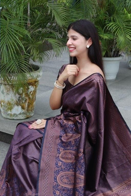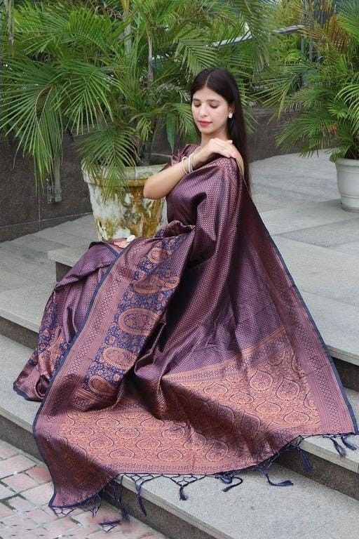 A stunning purple-brown woven saree drapes beautifully, featuring intricate paisley-like motifs and geometric patterns in navy blue and gold tones. The rich color and elegant designs create a textured effect, adding depth to the fabric. The saree’s traditional draping style, exudes a sense of sophistication and timeless grace. Perfect for festive or formal occasions, this saree combines classic beauty with modern style.