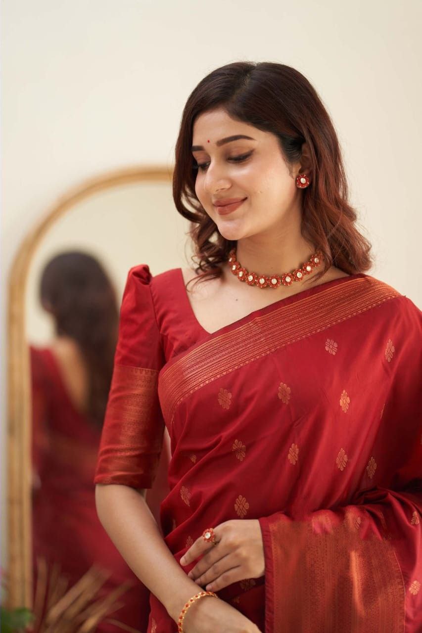 This Red Kanjivaram silk saree embodies elegance and tradition with its rich silk texture and intricate woven patterns. The vibrant Red hue radiates sophistication, making it a perfect choice for weddings, festivals, and formal gatherings. The saree comes with an unstitched blouse piece, allowing for customization to your preference. Crafted with meticulous attention to detail, the luxurious fabric enhances your grace, making it a must-have for any celebratory wardrobe.