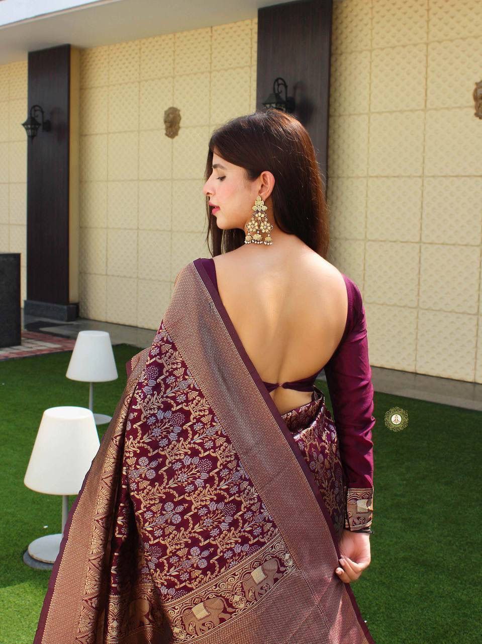Embrace timeless elegance with this beautiful wine-colored Kanjivaram silk saree. The saree features intricate all-over designs and a stunning pallu that adds grace and charm. The matching border enhances its rich appeal, making it perfect for weddings, parties, and special occasions. Please note, the blouse is unstitched, and jewelry is not included. Elevate your traditional wardrobe with this luxurious, classic piece for an unforgettable look.