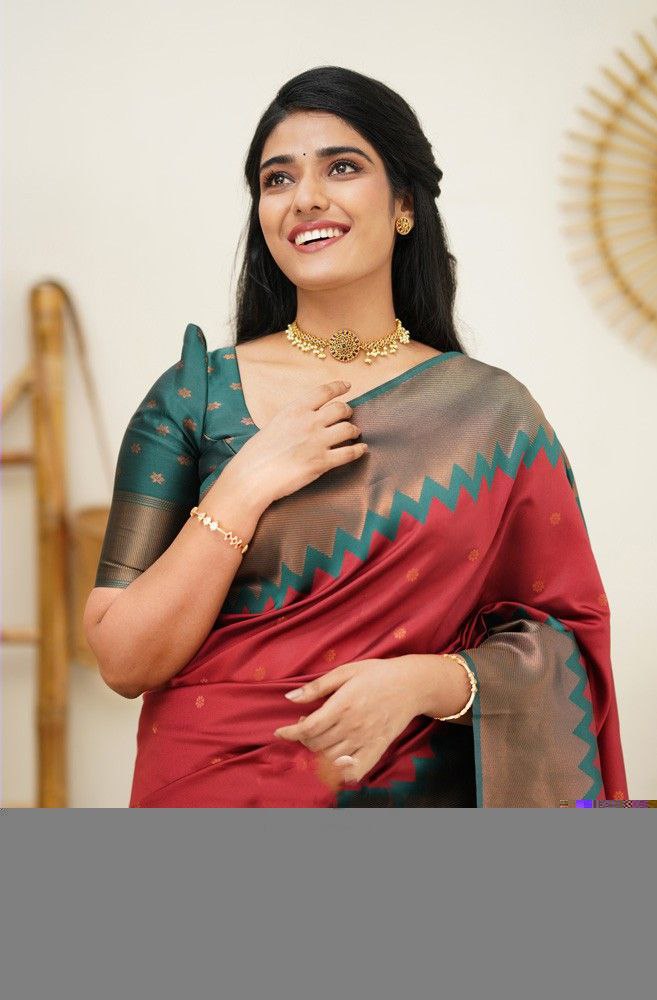 Experience unmatched elegance with this beautiful Maroon soft silk Kanjivaram saree, designed to captivate with its striking zigzag border. The luxurious fabric ensures comfort, while the intricate border adds a touch of sophistication. Perfect for festive occasions or special events, this saree comes with an unstitched blouse piece, allowing you to style it your way. Draped in timeless tradition, this saree redefines elegance!
