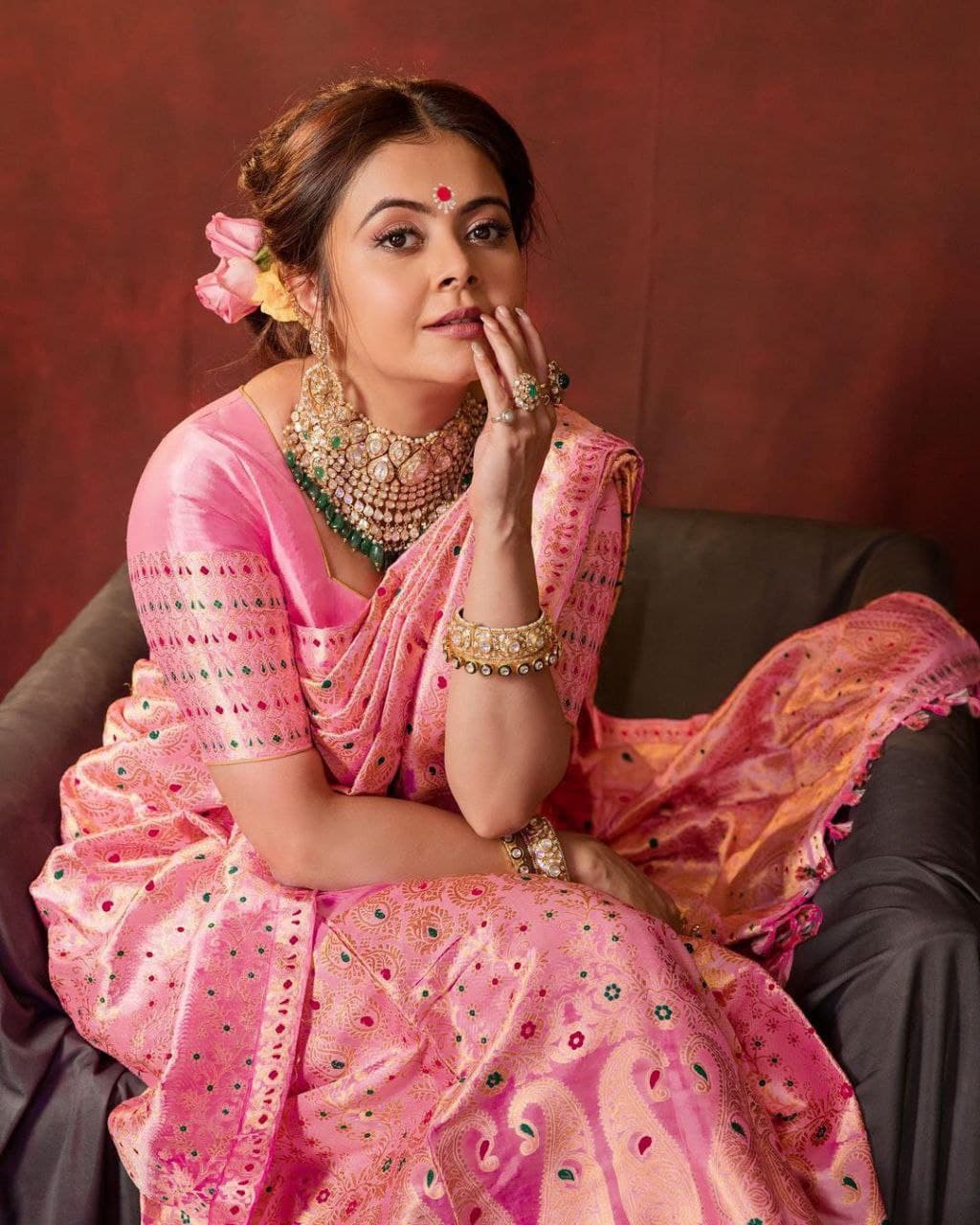 A stunning portrait of a woman, possibly an actress, adorned in a vibrant pink silk saree. The intricate details of the saree, featuring traditional motifs and embellishments, are showcased beautifully. Her elegant pose and radiant smile complement the rich colors and luxurious fabric. The image evokes a sense of grace and traditional beauty.